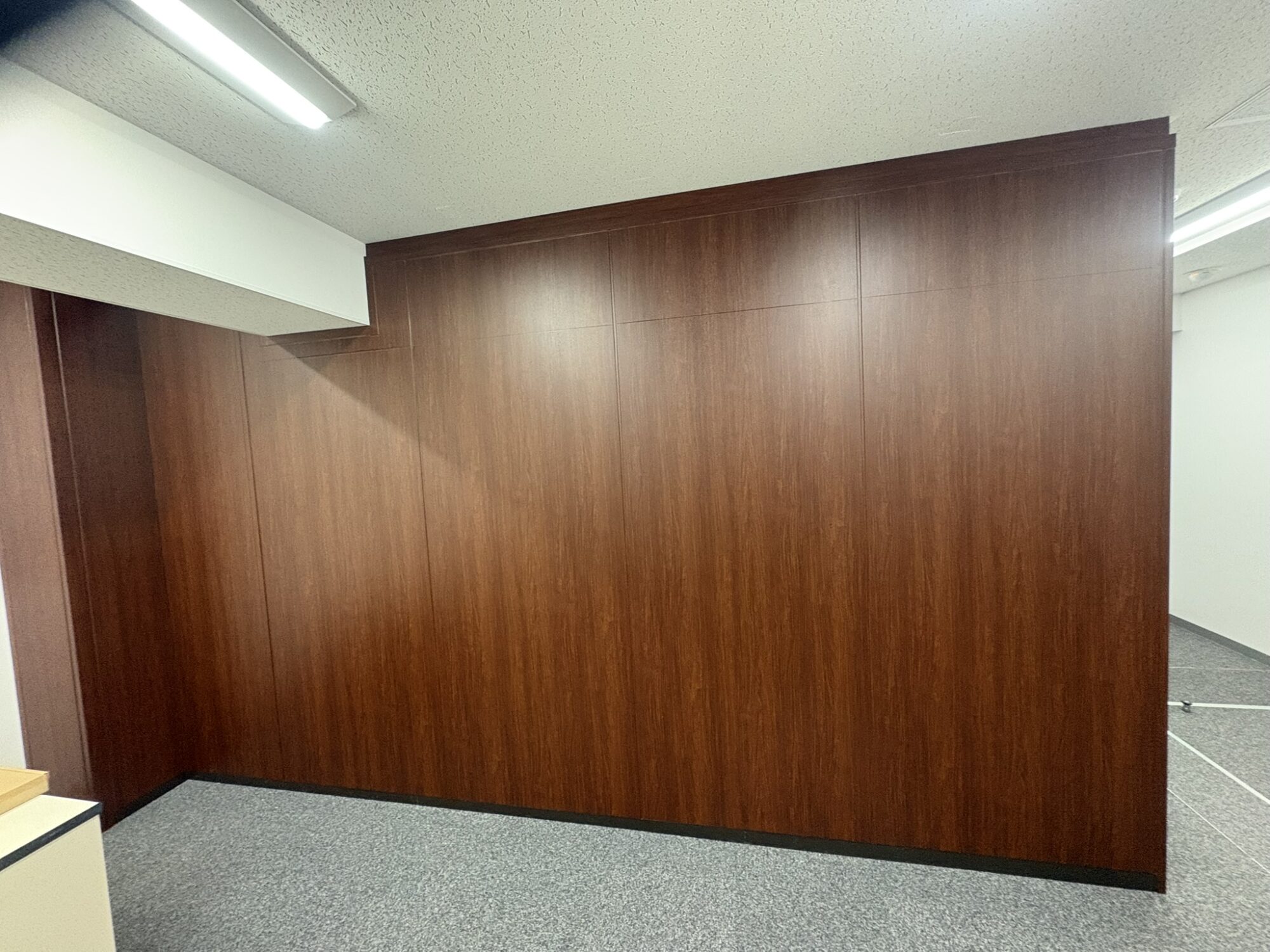 壁面全体に木目調ダイノックシートを施工し、空間全体に重厚感と落ち着きを演出。既存の内装と調和させながら、品格あるエントランス空間へと仕上げました。