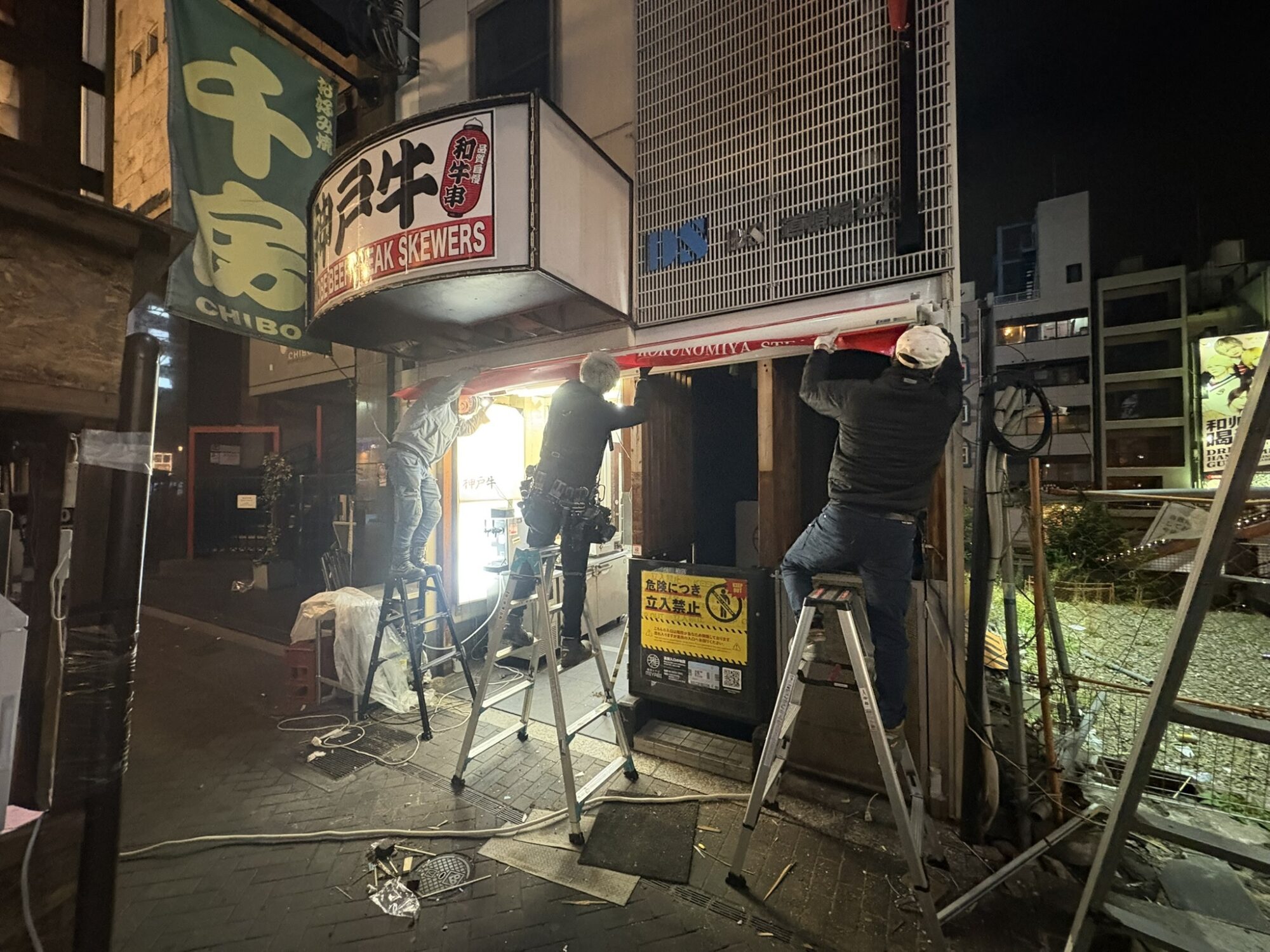 大阪市内の飲食店様にて、オーニングテントおよびフラッグサインの施工を行いました。